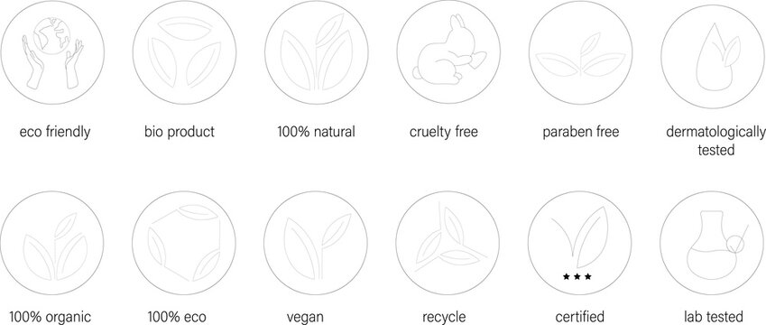 Vector set of logo design, icons and badges for natural and organic cosmetics; cruelty free, organic, natural , eco, vegan, recycle, bio product, lab tested, certified, paraben free and eco friendly.