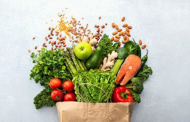 Closeup of vibrant freshly harvested organic produce at farmers market. Locally grown fruits and vegetables and bio products are available at the outdoor farm fair trade booth.