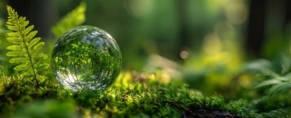Green glass globe on moss in a forest with sunlight, banner, and copy space concept for environmental protection and ecology themes. this background is suitable for earth day.