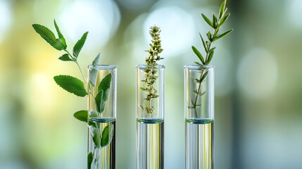Organic plant extraction research with test tubes in a green laboratory setting showcasing biochemistry and herbal oil technology