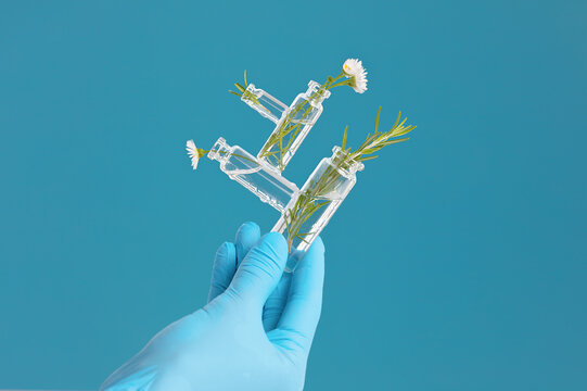 A bouquet of medicinal daisies and rosemary in a glass bottles in hand in disposable gloves on  blue background. The concept of alternative medicine.