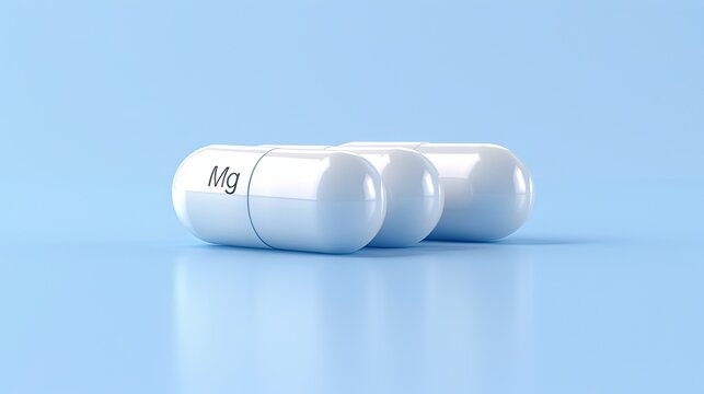 Three White Magnesium Capsules Resting on Soft Blue Background
