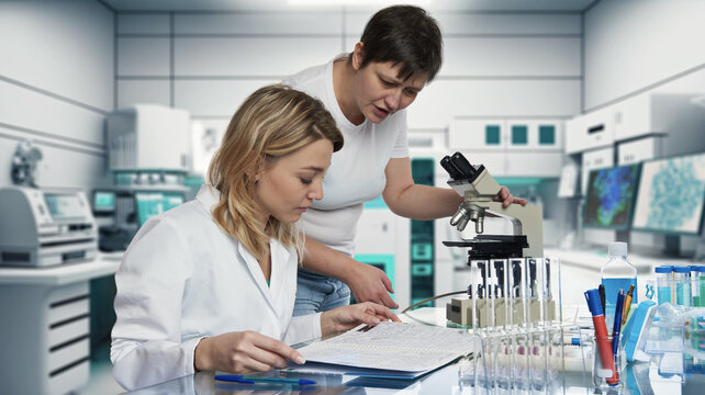 Caucasian female scientists, biologists, biochemists working in research laboratory. European researchers performing experiments in pharmaceutical or academic research facility.