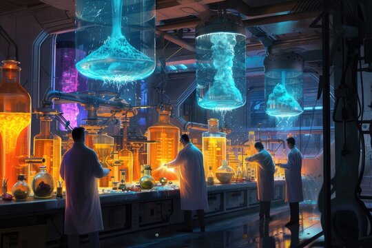 Mysterious laboratory with glowing beakers and colorful liquids