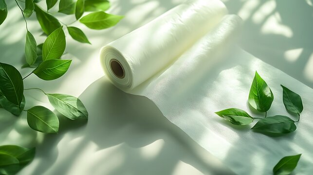 A product shot of a roll of biodegradable trash bags unrolling on a neutral background, minimal composition with green leaves placed nearby, soft diffused lighting, clean eco-branding aesthetic,