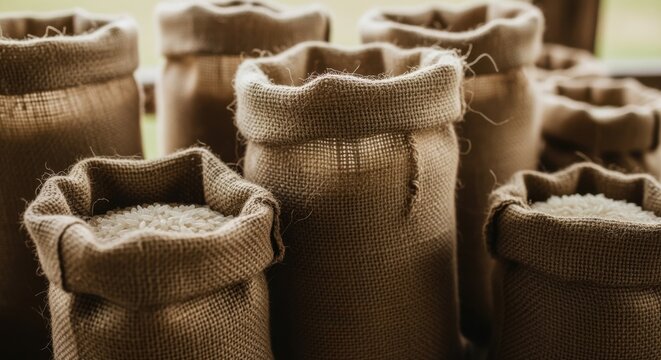 Medium shot of biodegradable rice bags showcasing ecofriendly jute fabric with natural texture and rustic appearance for sustainable packaging solutions.
