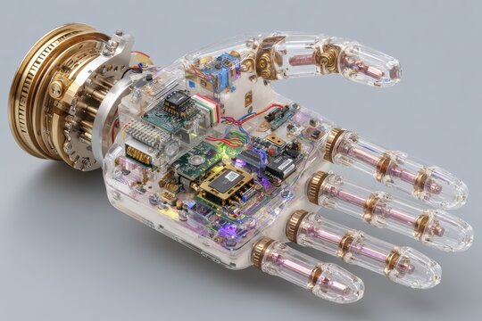 Intricate Transparent Robotic Hand Featuring Advanced Circuitry and Colorful LED Lights Showcasing Technology and Innovation in Robotics and Engineering