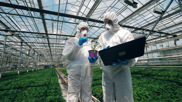 Female agriculturist inspecting hydroponic vegetables in greenhouse