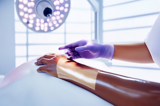 A medical professional applies an artificial skin graft to a patient's arm in a high-tech surgical environment. Advanced biotechnology for wound healing, tissue regeneration, and burn treatment.