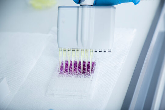 Scientist in gloves takes a sample for research in the laboratory. Hand of doctor putting biomaterial for analysis in test tube. Medical examination, microbiology.  Close up