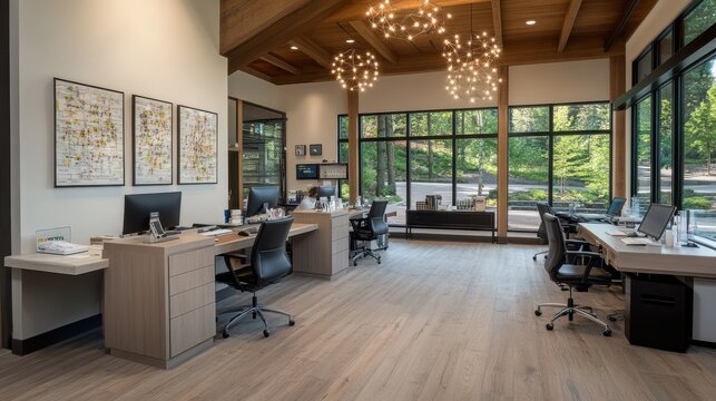Modern biohacking clinic with sleek interiors, surrounded by greenery through expansive windows, offers cutting-edge wellness treatments.