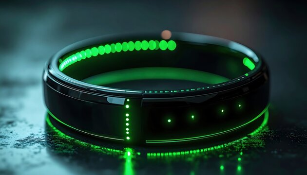 A futuristic glowing smart ring with green lights representing wearable innovation, health data tracking, digital trends, and modern accessories
