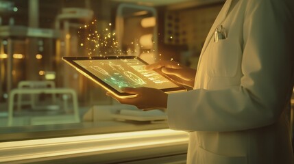 Biotechnology: Businessman holding virtual interface panel of digital device on global networking, genetic engineering, sustainability, medical research, and biotechnological technology in futuristic.