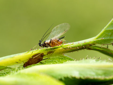 Parasitoid wasp (Aphidius colemanii) ovipositing in Rosy apple aphid (Dysaphis plantaginea) pest of apple trees.