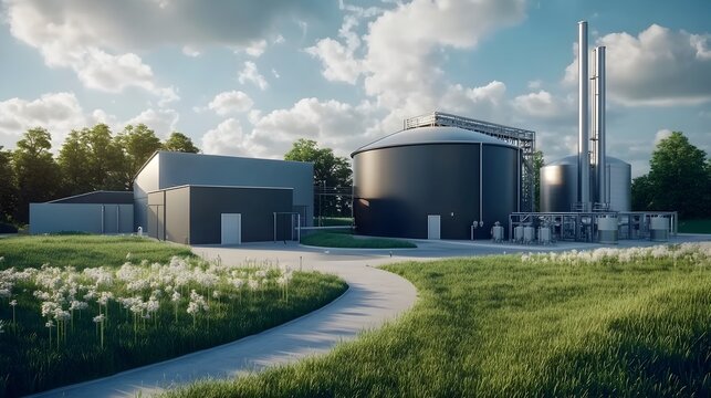 Biogas plant converting organic waste into renewable energy with storage tanks and processing equipment in the background  The facility produces biofuel through anaerobic digestion of biomass