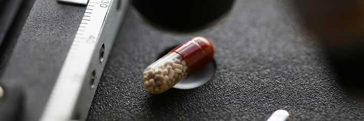 pharmacy production line filling glass containers with vibrant medication capsules and tablets, symbolizing medical manufacturing process biologically active additives
