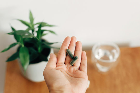 Hand holding spirulina capsule above glass of water on wooden table. Morning vitamin nutrient pill. Dietary supplements. Health support and treatment. Biologically active additives