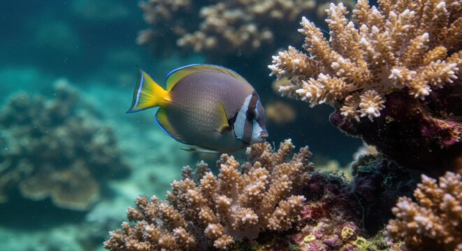 Close-up of a yellow angelfish exploring coral formations in a tropical underwater reef.