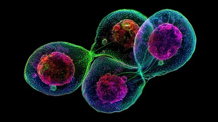 Microscopic image of cell division process with bright fluorescent colors and detailed structure