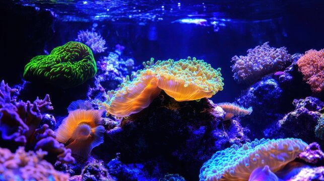 Vibrant, bioluminescent underwater organisms with glowing tentacles and colorful structures.