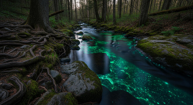 Woodland stream with bioluminescent water flows through moss-covered stones and tree roots, representing the natural beauty and wonder of the forest