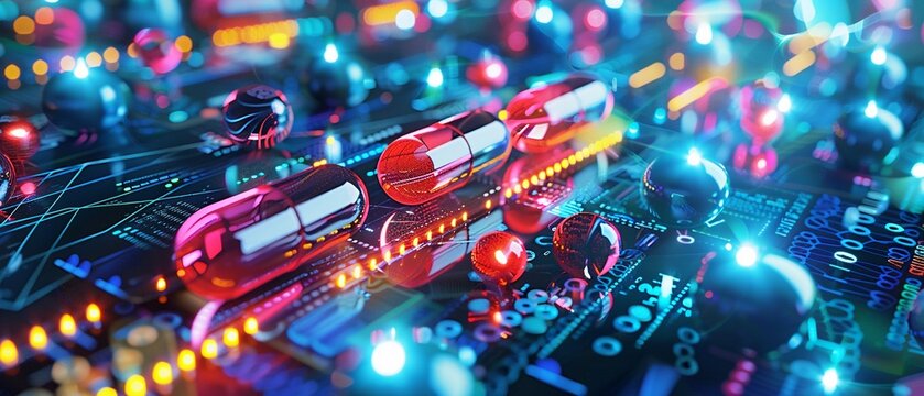 Hallway with many icons and icons. Holograms of medical tools in corridor at a hospital. A futuristic thermometer with a new technology. A corridor filled with numerous symbols and images lifestyle.