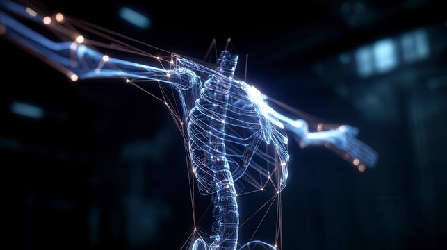 Innovative 3D digital wireframe model of human torso showing ribcage and skeletal structure against dark background, medical technology visualization for healthcare innovation