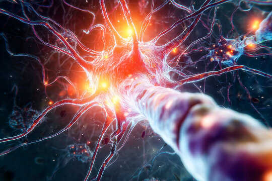 Stunning medical visualization of arm with nerve damage and wrist pain, glowing in vibrant red and blue, ideal for health and science projects.