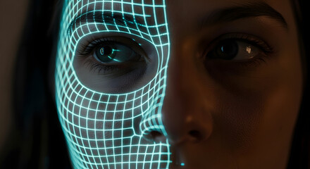 A woman's face with a glowing blue digital grid overlay on one side, representing facial recognition technology.