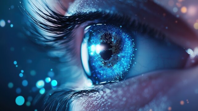 Close-up of a human eye with digital interface elements overlaid showing holographic technology, concept for artificial intelligence, virtual reality and biometric identification