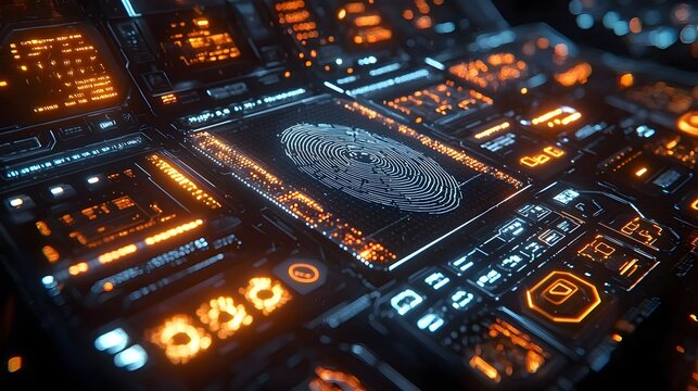 Futuristic digital interface displaying biometric fingerprint scan and data analysis visualization