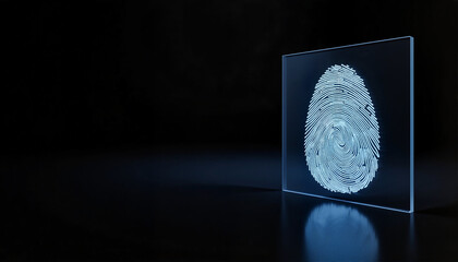 Digital fingerprint design shows circular patterns and lines on a dark background with bright blue details in a modern technology setting