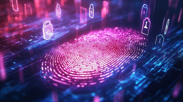Glowing Fingerprint Icon Surrounded by Holographic Cybersecurity Shields