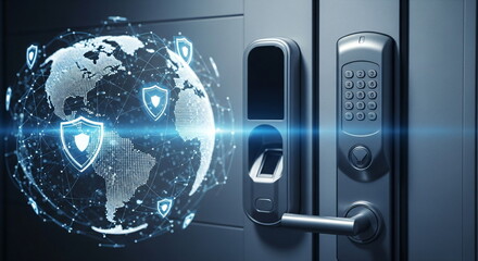 Digital earth with security shields and a smart door lock system. Global data protection and network safety concept. Data privacy.