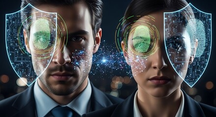 Futuristic Biometric Security: Man and Woman Protected by Digital Fingerprint Shields