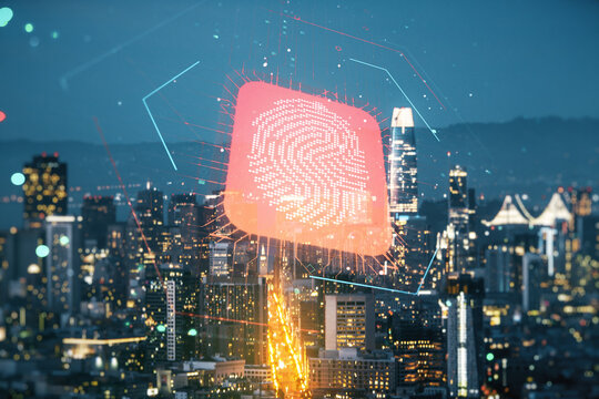 Multi exposure of virtual fingerprint scan interface on San Francisco office buildings background, digital access concept