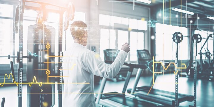 Scientist in lab coat analyzing data on a digital screen, surrounded by fitness equipment and measuring tools. Sports science,health monitoring, sports performance