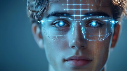Close-up biometric facial scanning with tech grid overlay