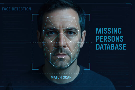 Futuristic digital image showcasing a glowing grid map overlay on a person s face representing advanced facial recognition and biometric identification technology