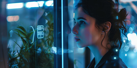 Businesswoman exploring biometric fingerprint security in office