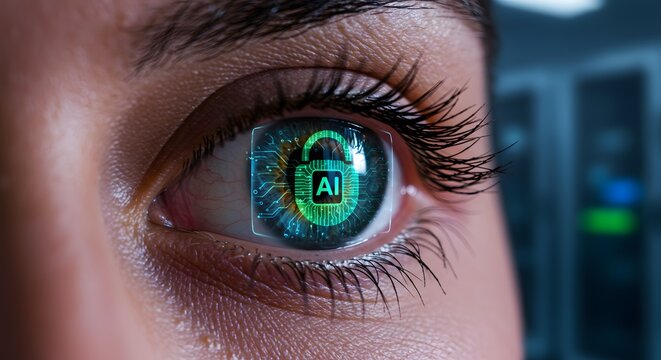 AI cybersecurity scene with warning indicators and a locked padlock on a digital interface, representing data protection, threat monitoring, and cyber-risk prevention