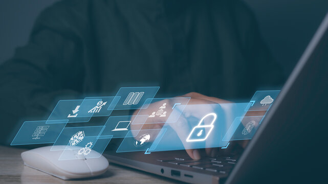 In order to acquire access to a private system. Biometric fingerprint scanning enables secure network access. On a laptop computer, a person is employing finger print authentication technology.