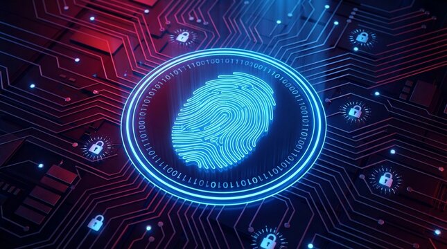 Digital Fingerprint Security on Circuit Board with Glowing Blue Light.