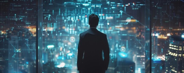 A businessman use artificial intelligence screen. Scientist computing and analysing data