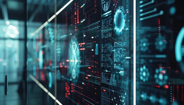 hand touches the screen of an AI interface with futuristic holographic data and graphs on it, surrounded by digital displays showing various technological