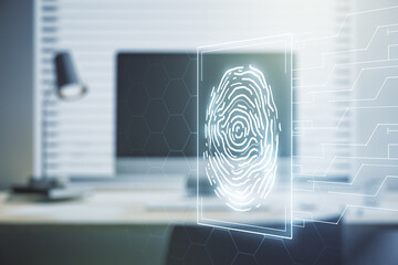 Double exposure of virtual creative fingerprint hologram on empty room interior background, protection of personal information concept