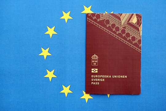 Swedish biometrical passport on European Union flag background. Concept of citizenship of Sweden