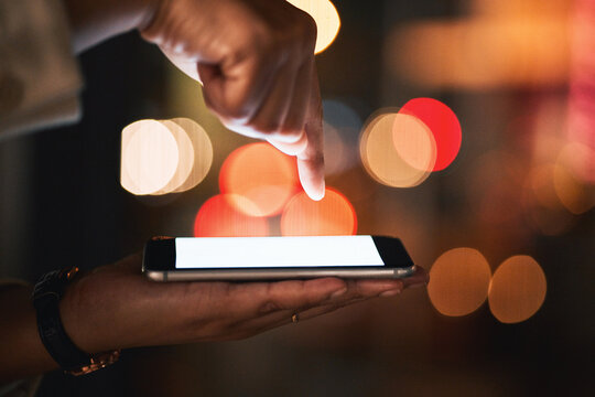 Hand, phone and fingerprint access with a business person outdoor in the city closeup at night. Cybersecurity, password and biometrics with an employee holding a mobile for a social media dashboard