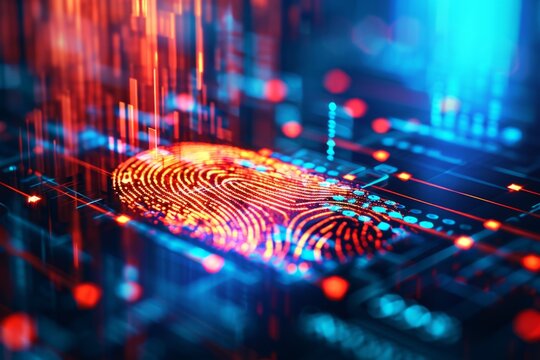 Biometric fingerprint scanning on futuristic digital interface