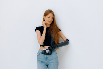 Portrait of young woman with short curly hair and amputee arm isolated on white background